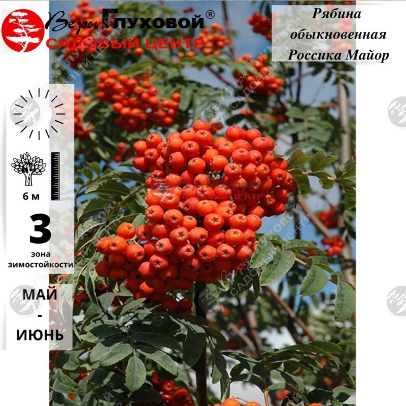 Рябина обыкновенная "Россика майор" отличается яйцевидной кроной с направленными вверх ветвями и темно-зелеными листьями с красными черешками.