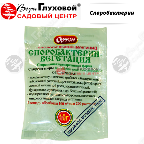 Споробактерин - эффективное средство для защиты офощных, плодовых, цветочных культур, газонов от грибков и бактериальных болезней. В качестве действующего вещества используются споры Trichodermaviride и Bacillussubtilis. Проявляет профилактический и лечебный эффект поотношений к мучнистой росе, фитофторозу, ложной мучнистой росе, корневым гнилям, фузариозному увяданию, бактериальным пятнистостям, черной ножке, сосудистому и слизистому бактериозу, ризоктониозу, монилиозу, макроспориозу, серой гнили, мильдью, оидиуму, парше и др. болезней растений. Использовать средство можно начинать ранней весной и проводить вплоть до поздней осени. Для приготовления рабочего раствора необходимо смешать содержимое одного пакетика (10 г) с 10 л воды. Для замачивания семян необходим раствор из 1,5 г препарата и 1 л воды. Для опрыскивания в период вегетации - 50 мл раствора (10 г препарата и 10 л воды) на 1 растение. Для полива - 10 л раствора (10 г на 10 л) на 100 кв.м.