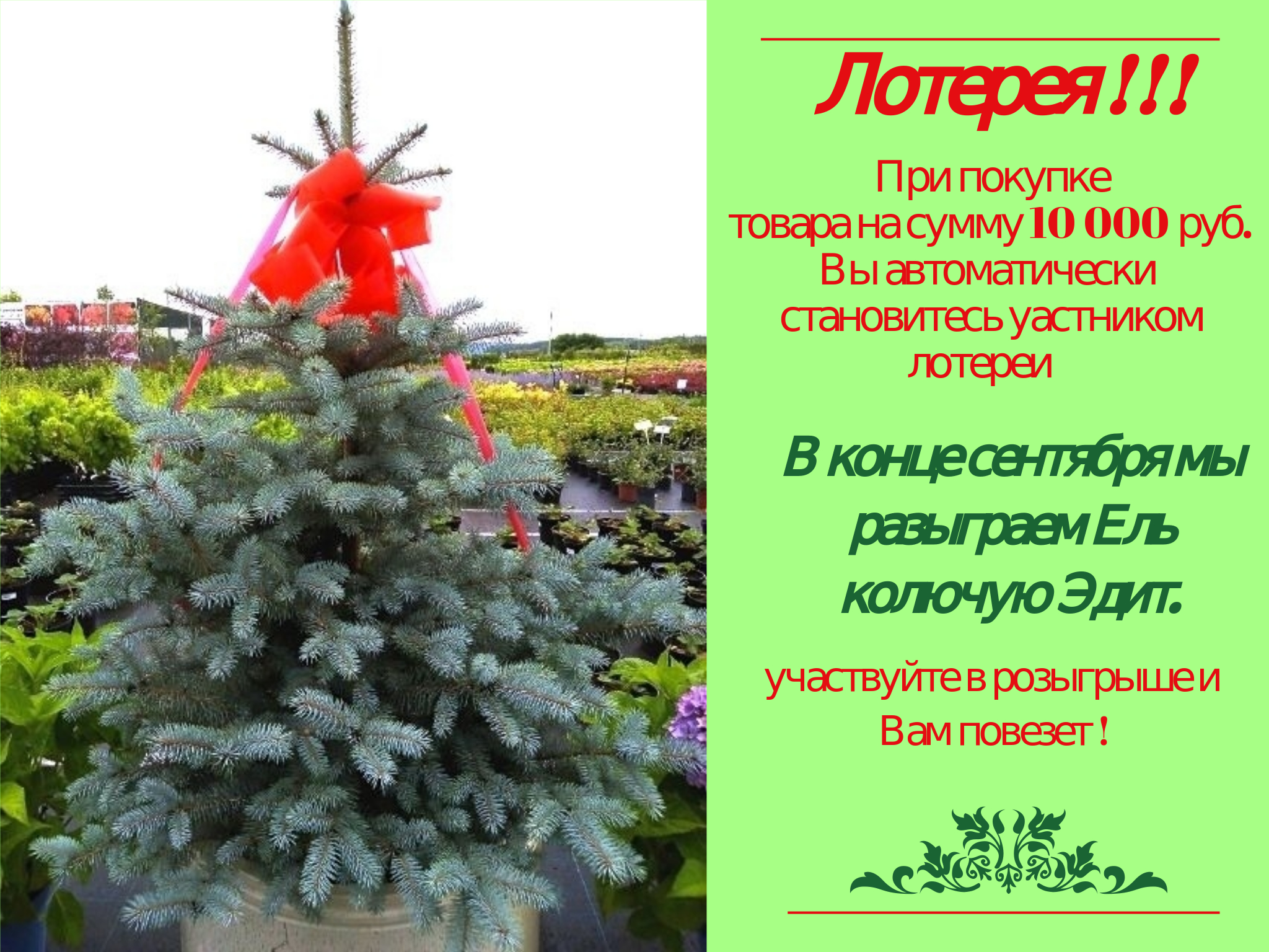 Для участия в нашей лотерее вам нужно приобрести товар на сумму 10 000 руб. (единовременно), оставить свои контакты в кассе садового центра и